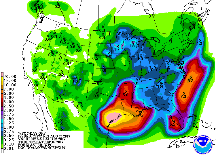 Plan for record flooding the next 7 days as of now. Rainfall totals may exceed 35 inches of rainfall with isolated totals approaching 40 inches according to the NHC. The WPC 7 Day Quantitative Precipitation Forecast Graphics are off their highest scale which is why you see now projected amounts listed. Please pay close attention to reliable sources. This is a very serious situation, if Historic. Not everyone will see those high totals, but the potential is there. Watch radar carefully. We will need to see where the feeder bands set up. It's under those feeder bands where the higher end of the projected highest rainfall totals will likely occur.