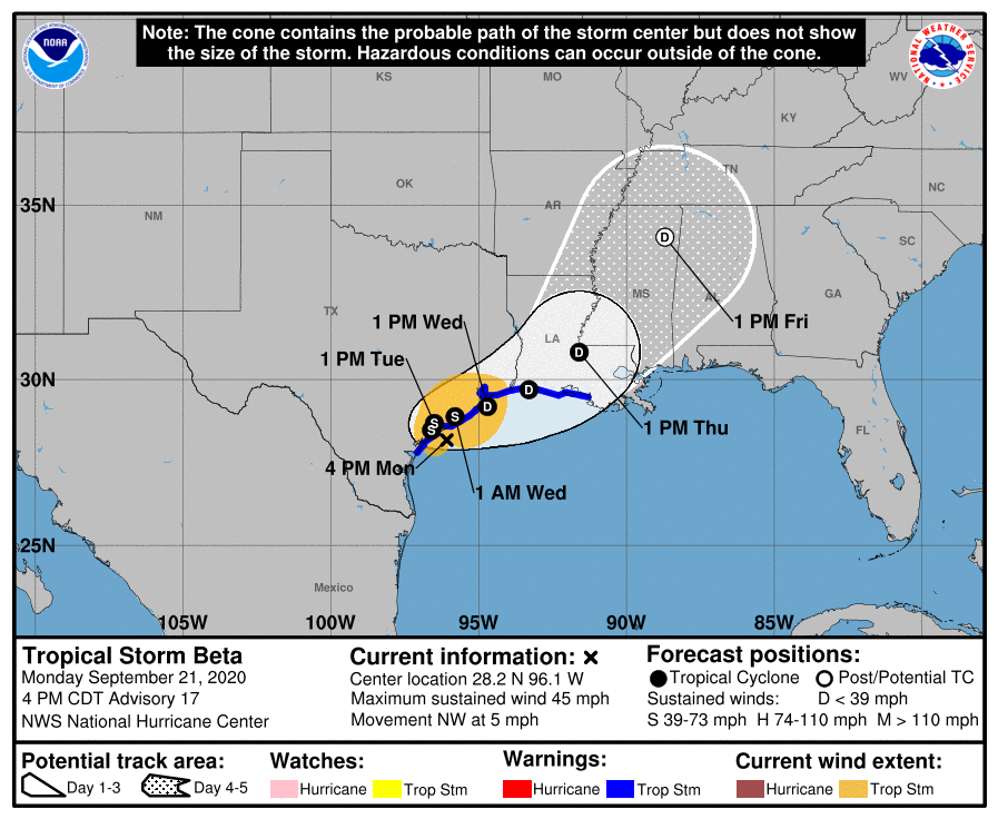 has Beta moving along/just off the Upper TX coast through tomorrow