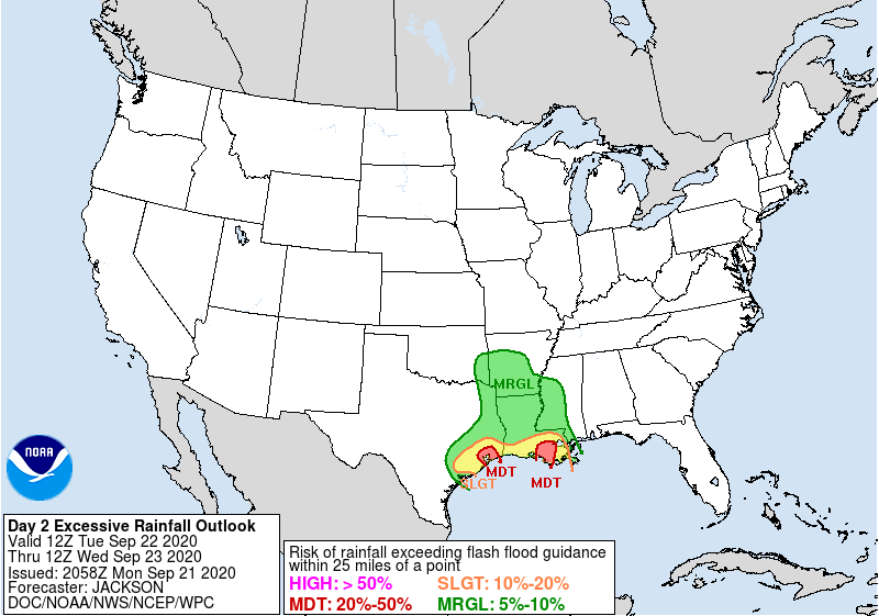With the center of Beta remaining southwest of much of Houston through Tuesday evening the threat for additional training rainfall will continue, but where any of these bands may set up is hard to determine. WPC has a portion of the area around Galveston Bay in a moderate risk for flash flooding again on Tuesday.