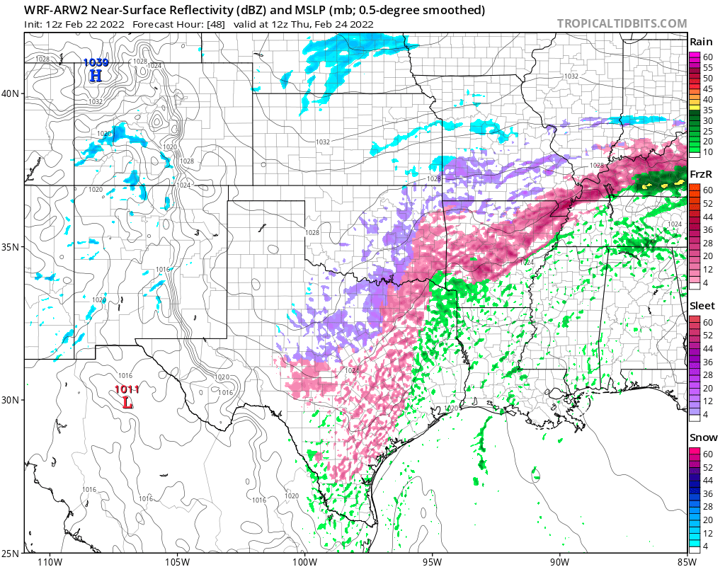 This is precisely why during tropical season we preach “don’t hug the models!!”Andrew wrote: ↑Tue Feb 22, 2022 4:07 pm Pretty amazing how far off the global models were with the stalling of this front. Instead of being in the upper 70s / low 80s tomorrow, most locations will be 30-40 degrees colder with temps in the 40-50s during the late morning and struggling to get any warmer than that during the afternoon. The globals still say return flow will occur briefly on Thursday before the reinforcing cold front pushes everything through, but some of the mesoscale models indicate that won't happen and we stay on the cold side of things through the rest of the week.