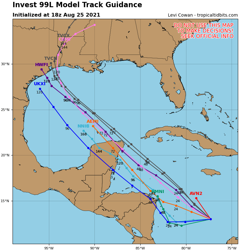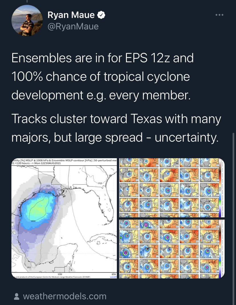 Unfortunately though, he could be correct about the idea of this being an intensifying cyclone at landfall. It looks like the closer this gets to landfall, the more favorable conditions become for RI on most models.jasons2k wrote: ↑Wed Aug 25, 2021 2:36 pm I hesitate to post because it’s not unusual for him to try to be one of the first to call for the worst case but he often gets burned. Take it with a grain of salt.