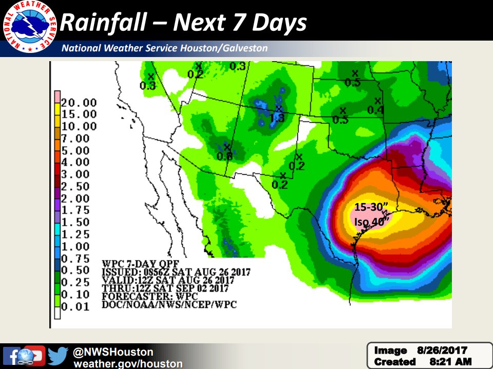 Models may be showing a lesser threat for Harvey inching our way through the week, but most models still have this storm stalling at least till Tuesday and that will just supply those feeder bands to move and train over areas in SETX. Out near Columbus and Sealy have already picked up nearly 10 inches and Houston area have seen 4-8. That is this morning alone. We still have about 3 full days of this, so I still expect some isolated areas to get 30+ inches since we are already at that minimum 10 inch estimate.Snowman wrote:It looks like models are backing off from showing the storm loop back to Houston. Every run shows the storm staying farther and farther west. I suspect that will spare Houston the 30+ inches of rain. I'm thinking more like widespread 10-15.