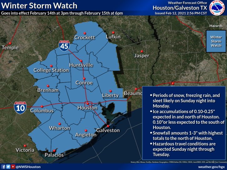 Right now the models just aren’t showing much moisture to work with south of 10 unfortunately but there’s still time for that to change.Kingwood36 wrote: ↑Fri Feb 12, 2021 5:19 pm Then why put ppl south of I 10 in the watch then..lol I don't doesn't make sense to me