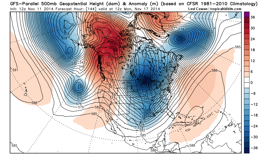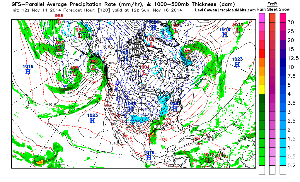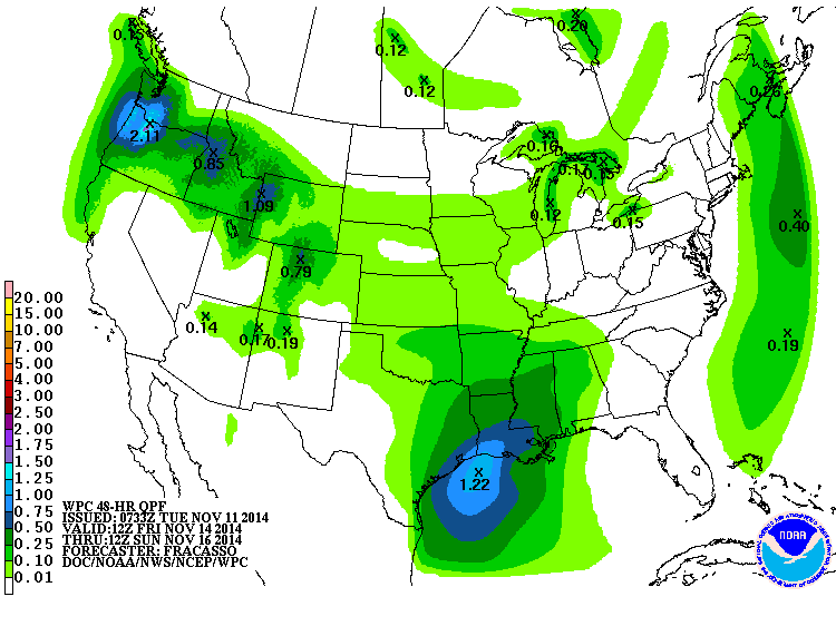There may be some slight moderation a bit closer to what we would expect normally this time of year later next week, but there are some indications that the very strong blocking regime reestablishes across the Polar Region as yet another big cold Upper Ridge builds into Alaska and the NW Territories of Canada near the day 9-10 timeframe. If that happens, we may see another push of very chilly air near the Thanksgiving Holiday period. The general upper storm track appears to bring upper level disturbance into Washington/Oregon/N California from the N Pacific dropping SE into the Southern Rockies and embedded upper air disturbances dropping S from W Central Canada with the Arctic jet into the Northern and Central Plains. The sub-tropical jet stream appears rather noisy as El Nino develops further lending to potential for areas of low pressure developing along the NW and Central Gulf Coast heading NE along the Atlantic Coast. A slowly building snowpack across the Plains and the Rockies appear likely into the next couple of weeks. Simply put, it appears that Winter is arriving a bit earlier than many expected and it could be rather chilly and stormy as we head into late November and early December. We will see.