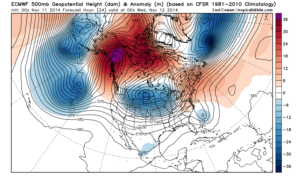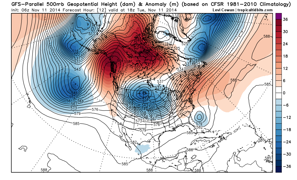Polar high anchors over the plains with bitter cold air mass for November standards. Temperatures across the plains will run as much as 25-35 degrees below normal for daytime highs. For example OKC will have a high on Thursday of only near 40 when the normal high is 65. To give an idea of the historic standing of this cold outbreak: Minneapolis, MN is currently forecast to go 13 days straight below freezing for daytime highs, with the previous record being 16 days all the way back in 1880.
