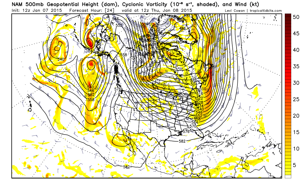 The 12Z NAM continues to suggest a stronger push of cold air arrives Thursday night into Friday morning. What raises an eyebrow are the impressive pressure readings across Alberta and the NW Territory of Canada. The NAM has a strong upper air disturbance dropping S across Alberta that will usher in another strong front. This 250mb upper air flow as well as the 500mb flow pattern is also concerning as it brings a lot of cold air across the North Pole heading S. Also, another major fly in the ointment is a cold string of High pressure ridging from the Ohio Valley back into Texas with that pesky upper low near the Baja Peninsula. That is typically a pattern we see when we get winter weather events across Texas. As Jeff stated, concern is growing that this threat may be legitimate and we really need to closely monitor things today into tomorrow as more information become available as to what our sensible weather may bring.