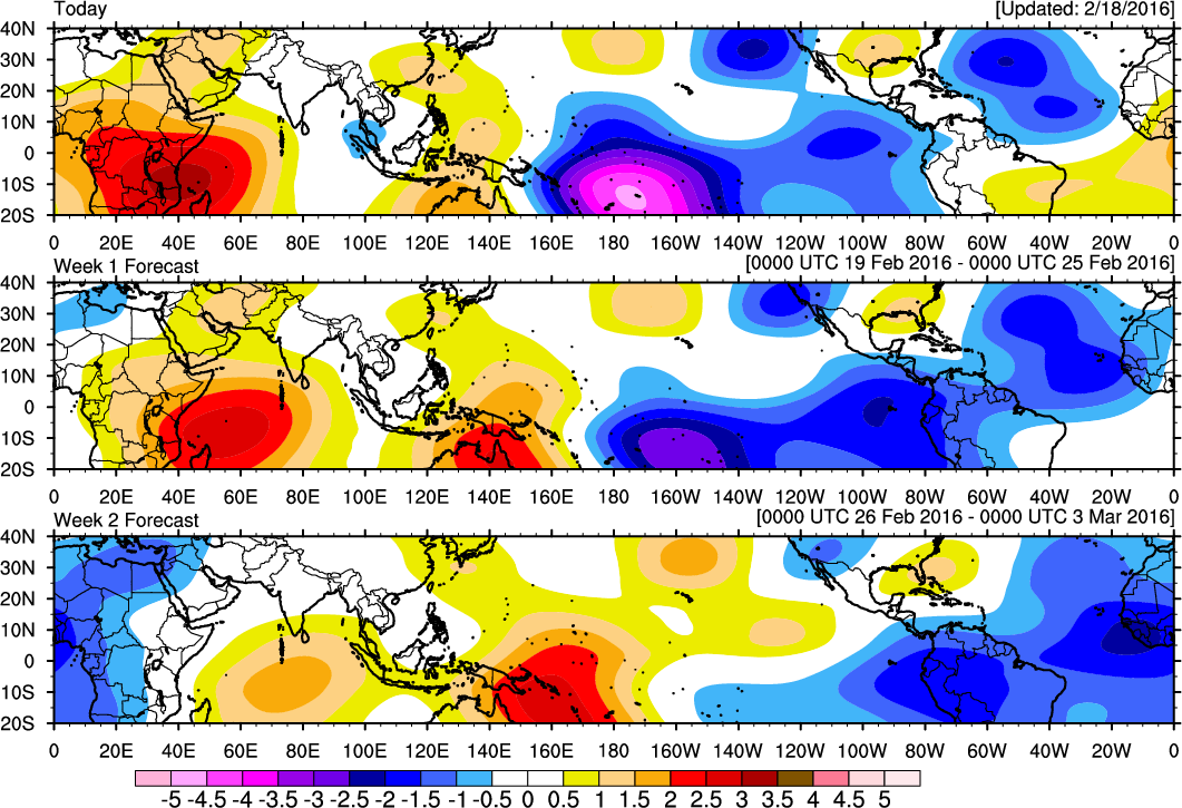 The overnight longer range guidance continues to advertise a robust Kelvin Wave progressing Eastbound across the Pacific with the MJO suggesting a wet phase developing across the Central and Eastern Pacific. The CFSv2 Monthly Precipitation Outlook for March has been very insistent of a return of rainfall across our Region as we end February and begin March.