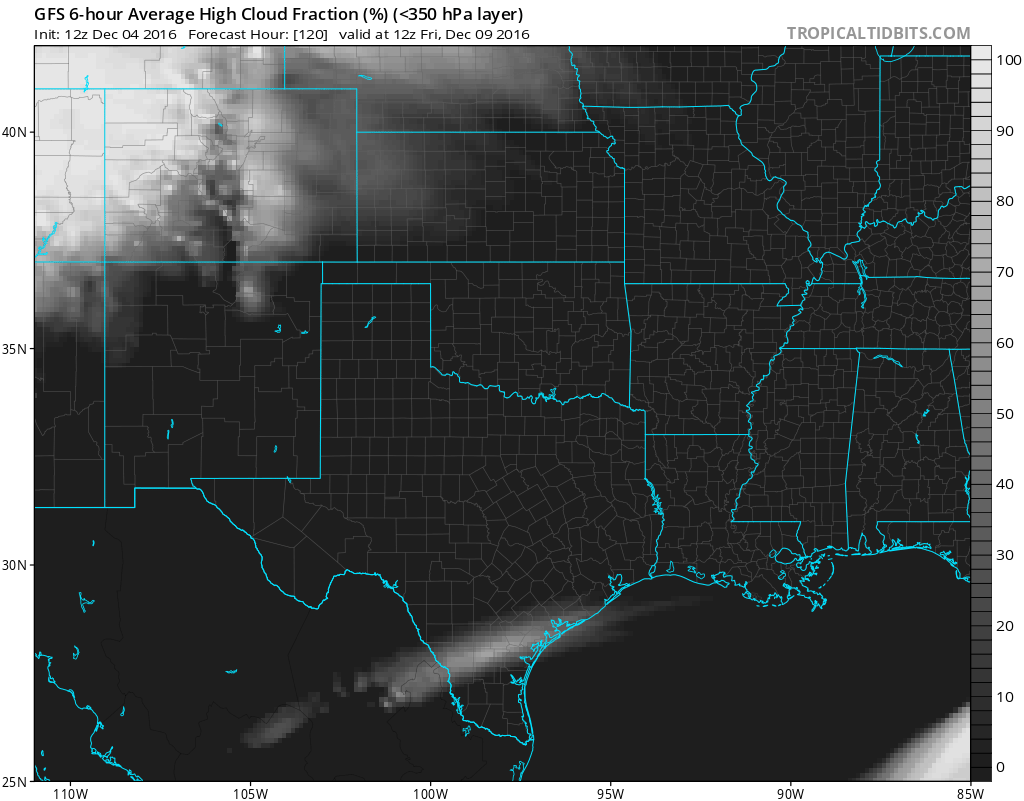 The 12Z GFS suggests the mid/upper level clouds may move out overnight Thursday into Friday making it a close call for the first freeze at IAH. We will see.