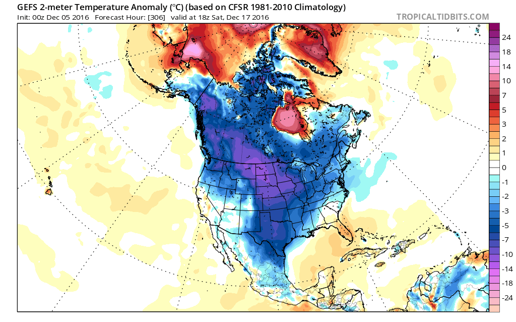 The longer range GEFS ensemble guidance continues to advertise well below normal temperatures may be possible beyond mid December. The Hemispheric Pattern driving all the continuing reloading of our source Region with very cold Arctic air is a very negative -WPO and negative -EPO with a tanking AO regime. Also following the contours of an anomalous Arctic Bering Sea/Eastern Alaska Ridge suggests a strong cross Polar flow continues into the 20th or so of December, if the longer range ensemble guidance is correct.