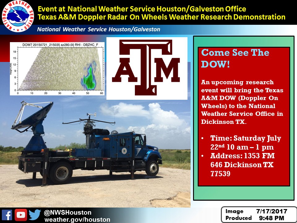 Looking for something fun and educational to do today that is free? Head down to NWS Houston/Galveston and see the new Texas A & M DOW and learn about their new research project concerning sea/bay breeze Thunderstorm Development!