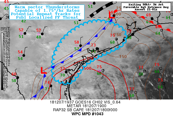 Mesoscale Precipitation Discussion 1043 NWS Weather Prediction Center College Park MD 231 PM EST Fri Dec 07 2018 Areas affected...Central Coastal Plain of TX... Concerning...Heavy rainfall...Flash flooding possible Valid 071930Z - 080030Z SUMMARY...Warm sector enhanced convection with potential for repeat tracks, may lead to isolated flooding/flash flooding through early evening. DISCUSSION...GOES-16 WV suite depicts leading edge of greatest height-falls are approaching across South Texas. This leads to favorable eastward shift of the ridge axis and placement of the warm sector across the coastal plain of Texas to be within the right entrance to the 90kt 3H jet streak enhancing vertical ascent and strengthening of low level inflow fairly orthogonal to the frontal zone draped from N of ALI to N of VCT to deepening surface wave NW of Houston Metro area. Sfc inflow of 15-20kts near CRP is advecting high Theta-E air (70F Tds) off the Western Gulf, and CIRA LPW fields suggesting saturated profiles starting to align over the front leading to total PWat values in the vicinity of 1.75" per GPS network. While cloud cover has limited solar insolation, temps to 75F support 750-1250 J/kg of SBCAPEs with consistent replenishing flow, though slowly veering with time. 10.3 um channel has shown continual shield of cooling tops, but now embedded overshooting CBs in Bee/Goliad county have reached -65C increasing the vertical depth for rainfall generation, likely indicating rates up to 1.75"/hr are probable in the next few hours. Cell motions to the NE at 20kts are likely to limit the duration at any given point to produce flash flooding, but it is the veering wind profiles and persistent and slowly increasing LLJ as the main height-falls approach that should support additional upstream development. As such repeat tracks are possible especially near coastal zones where enhanced convergence from friction at bay/inlet/cove intersections are likely to aid in the redevelopment process. Limiting factor is clearly dry antecedent conditions across the region, though reduced soil infiltration due to transition to winter ground conditions may support more runoff than FFG values would suggest, still flash flooding should be limited in scale and coverage, even the most aggressive Hi-Res CAMs such as the GEM-Regional, HRRR and HRRR-Experimental are only 2-3" through 00z, from San Patricio to Wharton/Matagorda county. Observational trends are favoring these models' orientation and evolution to suggest flash flooding may be possible through evening hours. Gallina ATTN...WFO...CRP...EWX...HGX...