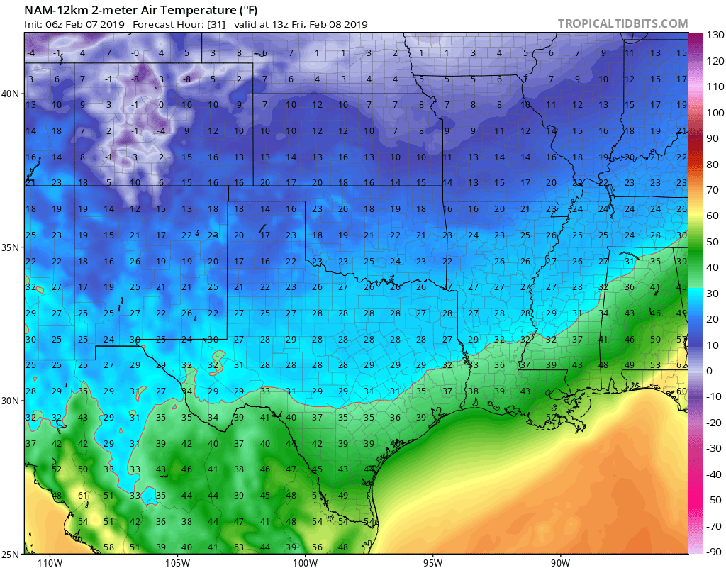 Looks like I was right about the cold. A bit of advection, but it's pretty modified. Overrun conditions, but not much chance of wintry stuff tomorrow here. Still a chance of icy, sleet-like conditions in the Hill Country.