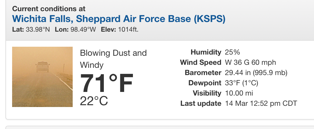 Getting a legit duststorm right now and the visibility is bad.This is my first time experiencing a full fledged dust storm. Currently under a High Wind Warning as winds may gust up to 75 mph. I also have my backup batteries charged just in case the power goes out today.