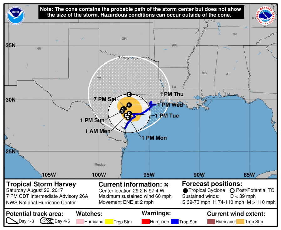 djmike wrote:NHC 7pm graphic now shows Harvey Moving NE at 2mph. Maybe yall were right seeing it move NE. BUT..its probably no more than a wobble at the time of posting. We shall see. Here in beaumont. Hefty rainbands today, picked up close to 3" today. If that continues for the next couple of days, we will reach our est 10-15" from harvey. Grounds are now saturated and wint take much for major flooding to begin after today. From what i hear, our days of heavy rains begin tonight into Tuesday.