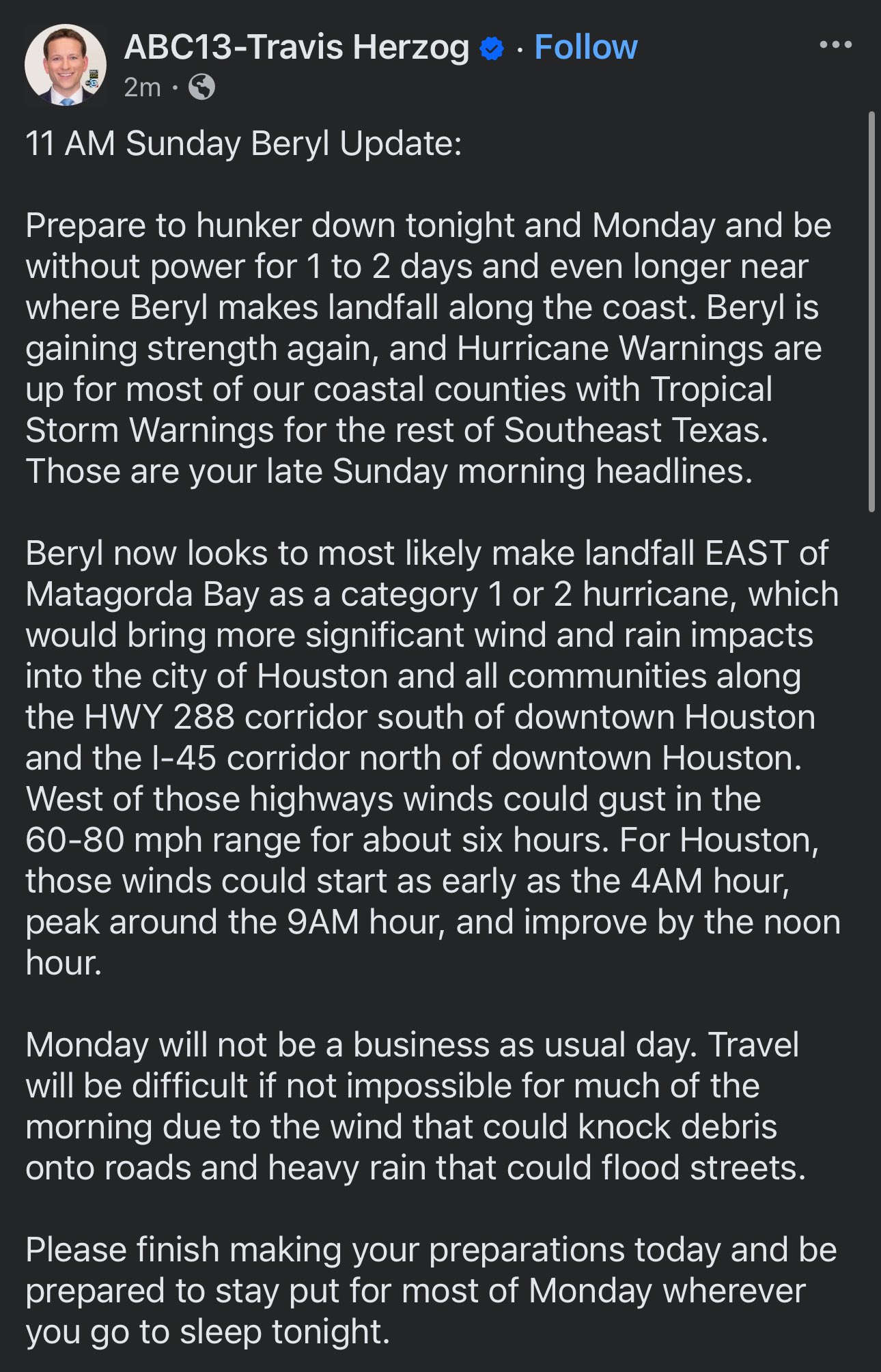 Tropical storm warning has been expanded to all counties in SE TX…Hurricane Warning remains for Matagorda and Jackson.
