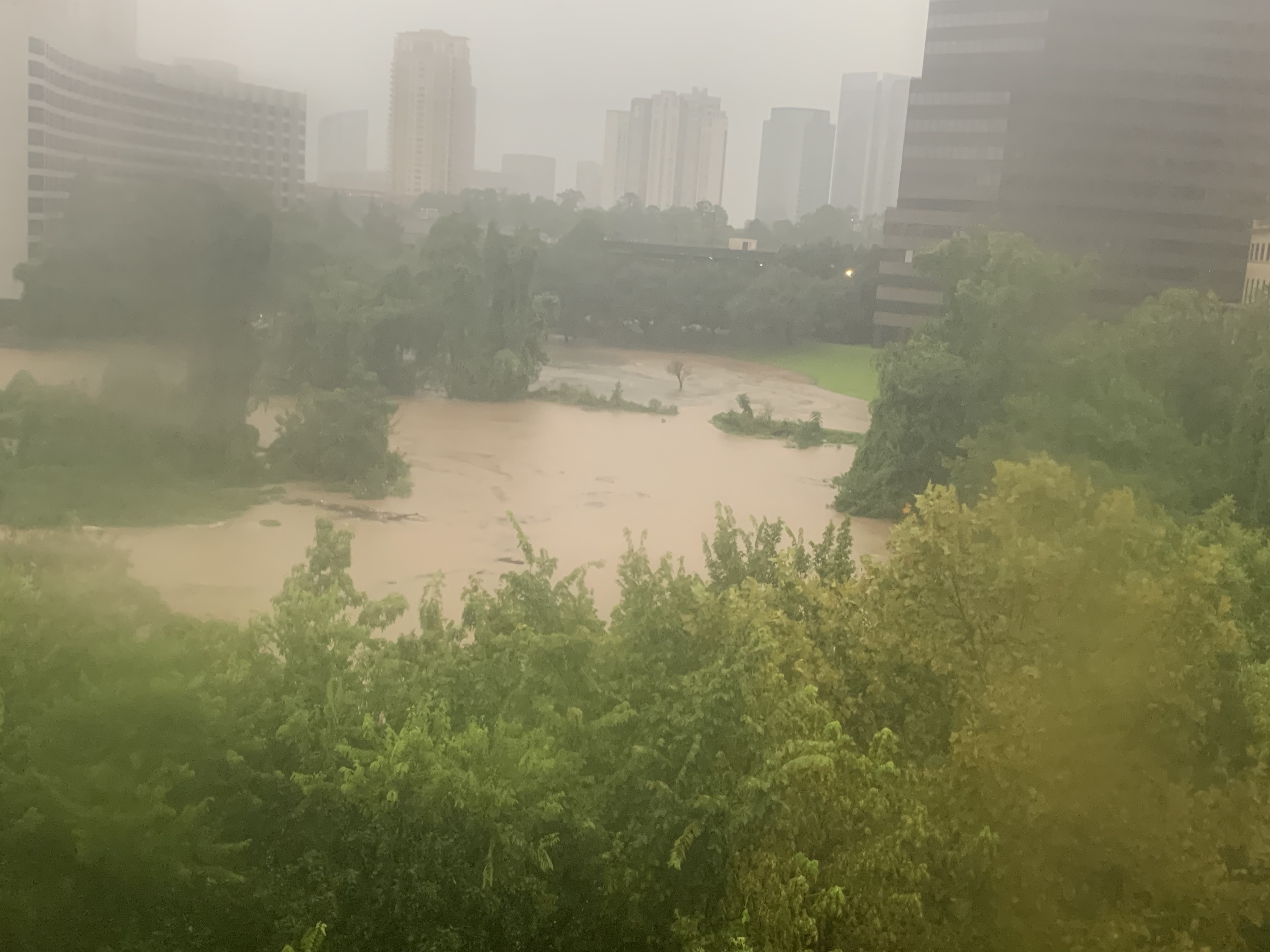 Buffalo bayou beginning to come out of banks behind the Omni Hotel.