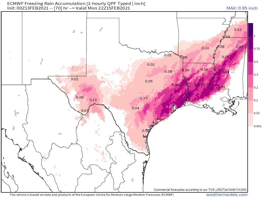 Freezing rain: 1/10th to 1/4th an inch over much of the area, especially the US 59 corridor