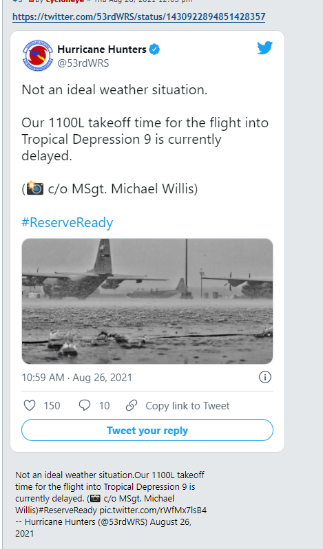 Stratton20 wrote: Thu Aug 26, 2021 11:30 am Hurricane reconnaissance flight is currently being delayed