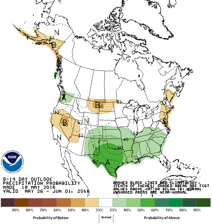 Still not seeing any significant pattern change as we head to the end of May. The afternoon updated Climate Prediction Center Outlook going out to the first of June suggests more unsettled weather with a continuous Western trough and rain chances.