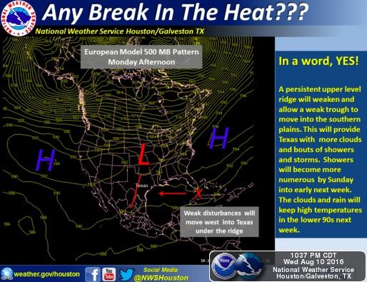 Another day of hot weather with Heat Advisories in effect across SE TX but a change is on the way as the ridge is forecast to weaken allowing a weak trough to develop across the S Plains. In addition the N Central GOM disturbance will propagate slowly W and WNW into TX later this weekend and into next week bring additional moisture.