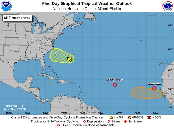 TD 17 and TD 18 have formed overnight over the far eastern Atlantic Ocean. Both of these systems are expected to move generally westward over the next 5 days, before turning more toward the WNW or NW by this weekend. Neither of these systems is expected to be a threat to any land areas through 5 days. An area of low pressure may develop off the US mid Atlantic coast late this week, but chances are currently near 30%.