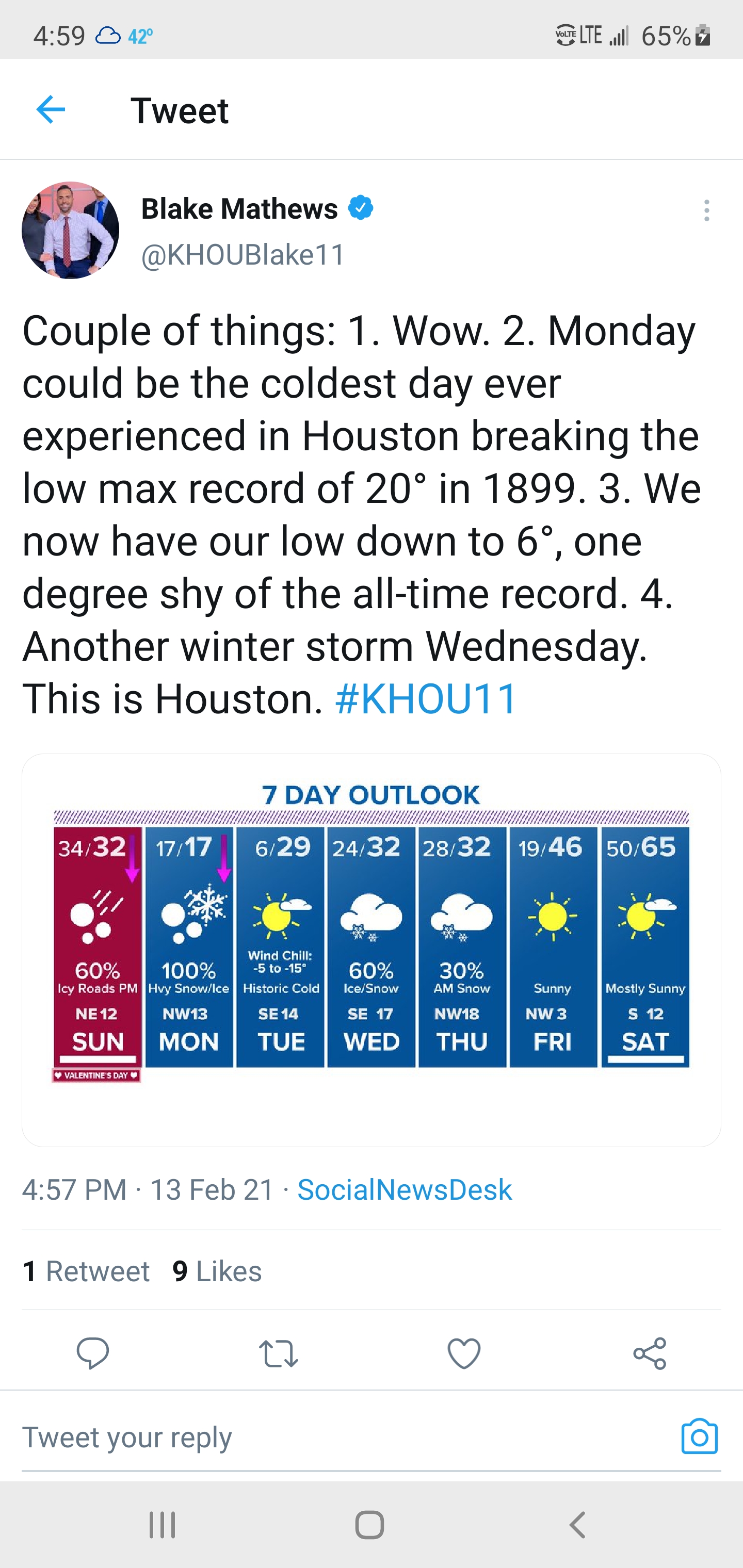 KHOU BLake wrote: Sat Feb 13, 2021 5:56 pm Thanks for the thumbs up, y'all but it really is a team effort. David, Addison, Chita and I have been pouring over every model and every scenario. We determined a few days ago that the models just have no idea. So we're using sensible meteorology; looking up stream and watching how bad the models are busting and looking back at 89 and 1899 and comparing and contrasting. Also, sometimes we forget to just go outside and look. The artic air has a sharpness to it. It just feels brutal. So through pattern recognition, models busting and looking upstream, we've determined that we'll likely not only make a run at the all-time record low max but also at the all-time record low. We're likely to have a tremendous amount of ice and snow on the ground. Couple that with a clearing sky (Even if not totally clear) and you have the recipe for a wipeout of records. I'm not saying its likely but certainly possible. This is historic. I never thought I'd use the word 'blizzard' on tv to describe our weather on Monday but that's exactly what's going to happen. It's history. We're lucky enough to experience something that other up and coming meteorologist and weather enthusiasts will look back on a hundred years from now and wonder what it must of been like as we do now about 1895 and 1899. Well, we're about to find out.