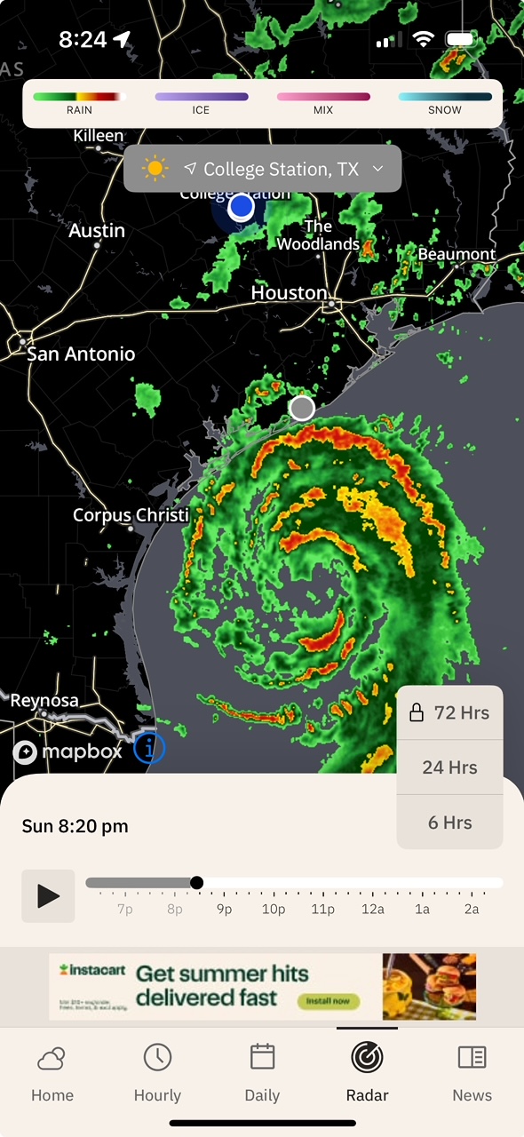 Looking like Freeport or a little east@ Cat 1. She running out of time ,which is a good thing. Hurricane models still say she will be strenghing until landfall, I just don't think so . I though at this point she will be a cat 1 already but she still struggling.