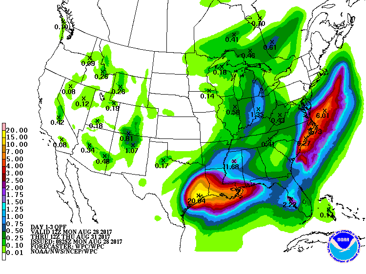 Morning Update 3 Day Weather Prediction Center Quantitative Precipitation Forecast suggests an additional 20 inches of rainfall may be possible across our Region. The Mesoscale guidance continues to paint an ominous picture as Harvey attempts to stregthen a little as it moves back offshore and concentrate heavy showers/thunderstorms around the center on its Northern and Eastern quadrants making its second landfall somewhere near Galveston Island and Chambers County. Winds are gusting to near 35 hours across NW Harris County at this hour.