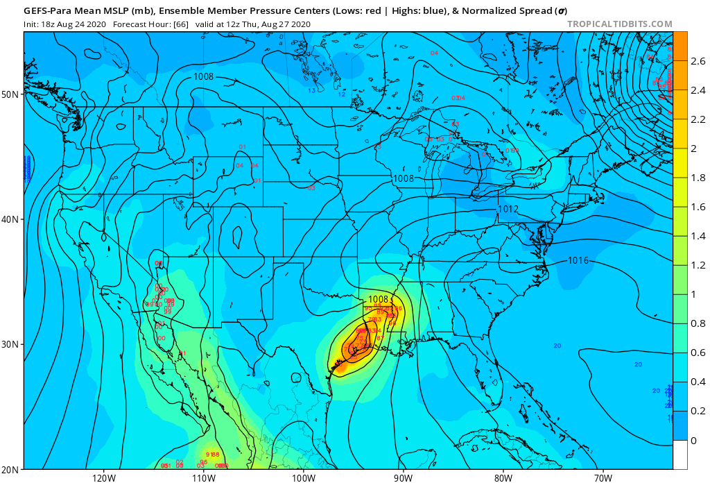 GEFSV2 (New, Parallel ensemble) continues to have many members west of the Sabine. Some, significantly. The ensemble envelope remains wide.
