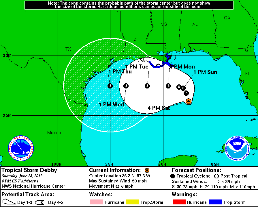 AT 400 PM CDT...2100 UTC...THE CENTER OF TROPICAL STORM DEBBY WAS