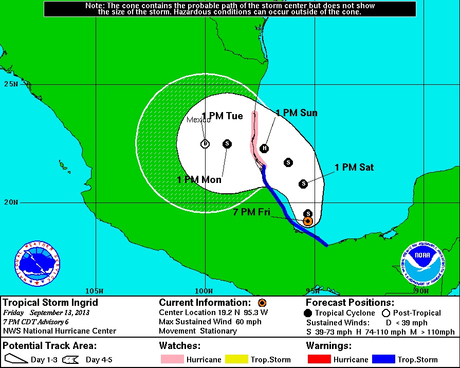 wxman57 wrote:Looks like we have TS Ingrid now. NHC will be upgrading by 10am. Center consolidated farther west near 19.3N/95.3W overnight. This reduces the risk (and benefit) to the lower TX coast, as model guidance has shifted southward to near Tampico again. Could even be south of there.