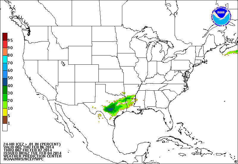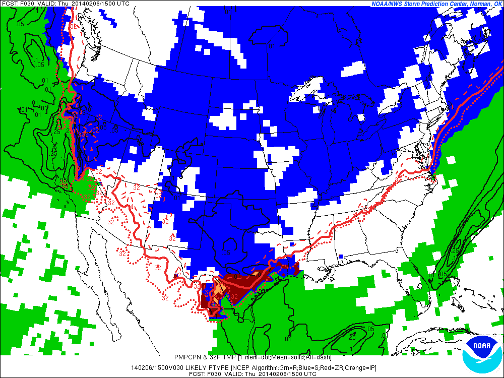 Changes begin tonight as the cold arctic air settles into the region and disturbances aloft begin to ride into and over the cold dome. Moisture and lift begin to increase late tonight, but the surface layer while cold will be fairly dry. As expected over the last few days, models have trended colder for lows on Thursday morning likely as a result of less modification of the incoming air mass over the snow covered plains. Expect temperatures to fall below freezing over much of the region north of I-10 Thursday morning. Incoming disturbance looks to arrive Thursday morning across the area and help to generate a period of very light rain or more likely drizzle/fog. NCEP probabilistic freezing rain probabilities of greater than .01 of an inch are in the 10-30% range from the College Station to Crockett area early Thursday. While temperature appear cold enough to support freezing of drizzle and rain on contact with elevated surfaces it is questionable still at this point if in fact any precipitation will fall over the area. Think the best chances of actually seeing precipitation is north of HWY 105 and this is also where surface temperatures will be the coldest. Some freezing drizzle or light freezing rain will be possible Thursday morning north of HWY 105, but expect impacts to be minor. Further southward to I-10 expect precipitation to be very light if at all while temperatures are near the freezing mark.