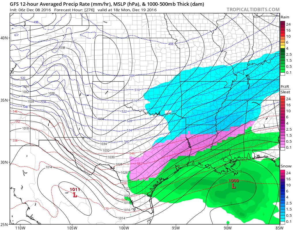 GFS still has a southern snow even beginning on the 19th in E Texas and LA.srainhoutx wrote:The latest GFS solution continues to raise an eyebrow around mid December and just beyond. Will need to monitor for the potential of a hard freeze around the 15th and a possible wintry weather trouble maker around the 18th is the GFS solutions are correct. Still way too soon to know with any certainty, but we'll be monitoring.