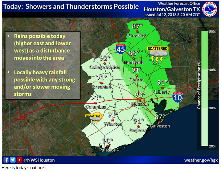 A 40% chance of scattered showers and a few thunderstorms with isolated locally heavy rainfall today. Mostly sunny skies with a 20-30% chance of an isolated afternoon shower or thunderstorm through the weekend across SE TX.