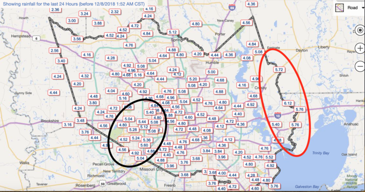 General widespread 2-4 inches of rain across much of southeast Texas. I have attached an image (quality of it may be blurry on the upload). Outlined in black is where a more concentrated area of 5 - 5.5 inches fell. There were also 5"+ in north and northeastern part of the county. Outlined in red are where some of the higher totals across the county have been out near Mont Belvieu (6.12" as of 1:52am).