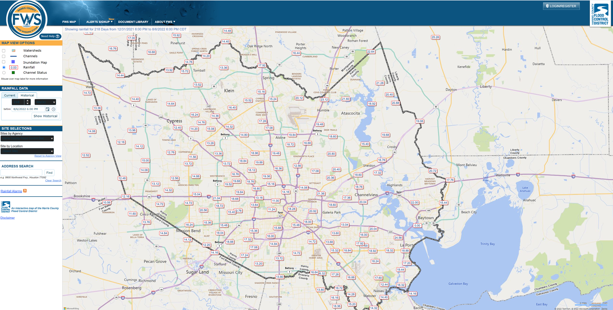 2022 Harris County Rainfall totals from 12/31/2021 6PM to 8/06/2022 6PM: