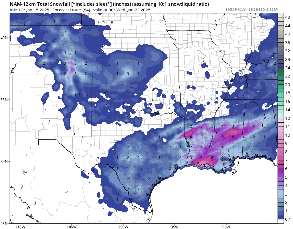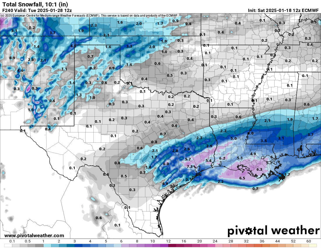 Stratton20 wrote: ↑Sat Jan 18, 2025 11:35 am 12z Euro definitely increased snowfall across se texas, 4-6 inches on 06z run to now 5–9 inches across a good majority of se texas, and that falls on top of ice and sleet