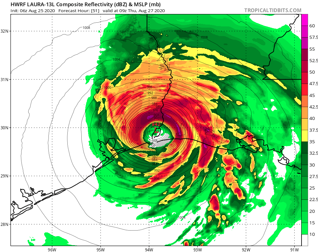First center pass of NOAA RECON suggests Laura continues to strengthen. Estimated Extrapolated 992mb.