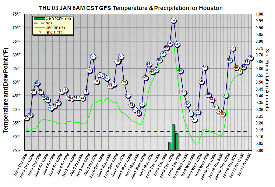 North of a line from Columbus to Kingwood to Livingston, the air column will require more work as lift will be weaker in this area and the above freezing layer is much thicker. Given the fact that sleet fell yesterday, I would not be surprised to see a mixture of light rain and sleet north of the above mentioned line. Throughout this region surface temperatures will be in the mid 30’s and any sleet will melt on contact. South of this line most of what falls will be liquid with a few ice pellets.