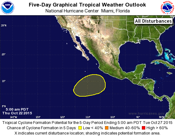 The NHC is monitoring another area of disturbed weather W of Patricia in the Eastern Pacific. The monsoonal trough is very active across the EPAC and it appears there are several more opportunities for tropical cyclone development with even another Major Hurricane making landfall along the West Coast of Mexico. The overnight Global models are suggesting a very active sub tropic jet pushing deep tropical moisture across Mexico and Texas through the end of October and into early November. There are additional indications that yet another Western trough will organize keeping our weather very El Nino like and unsettled with a couple of strong cold shots as well.