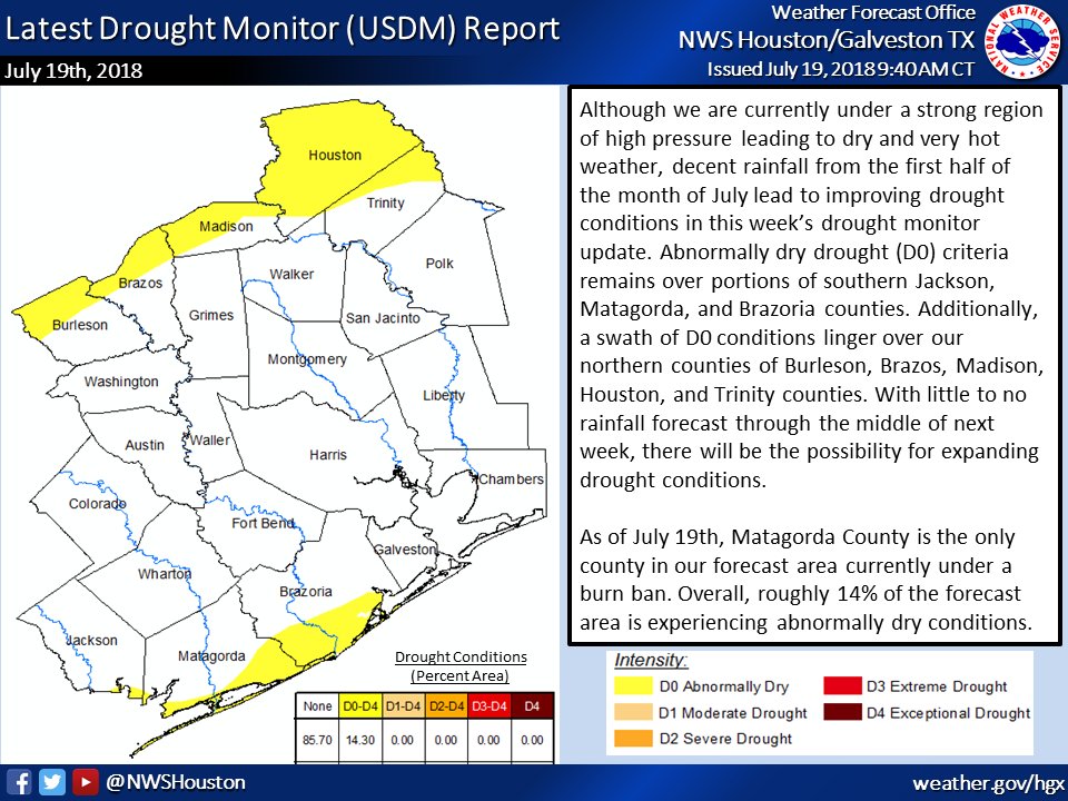 As of July 19th, Matagorda County is still under a burn ban. Overall, roughly 14% of the forecast area is experiencing abnormally dry conditions. With little to no rainfall forecast through the middle of next week, there will be the possibility for expanding drought conditions.