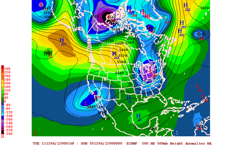 The 12Z GFS continues to advertise an upper air disturbance dropping into the SW and then shearing that feature out into a more troughy pattern elongated from the SW to NE. What will need to be monitored in future guidance is the development of a Coastal Low/Trough that provides for some over running and light rain once the front passes late Saturday night/Sunday morning. The GFS suggests a line of showers as the front moves by and then keeps us in the clouds with cooler temps and light rain chance into Monday. The big question will be if the southern stream energy can phase with a northern stream shortwave allowing colder air to head S. Regardless, it does appear the first winter storm of the season is taking shape for the Central/Southern Rockies and wintry mischief could settle as far S as W TX and the Panhandle. We’ll see what the rest of the operational guidance suggest, but also remember that guidance has been extremely poor in handling the pattern beyond day 3. The upper air feature that drops into he SW will not reach the RAOB network until sometime tomorrow as that feature is nearing the Gulf of Alaska/Pacific NW.