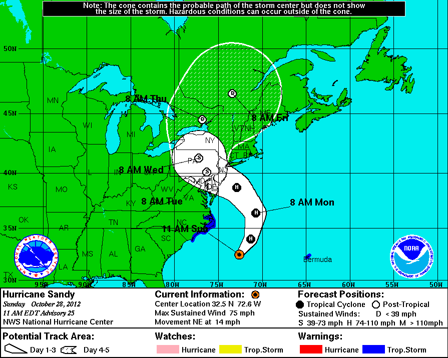 I am just amazed at the shear strength and size of Sandy. It's not often that you see in a Hurricane Advisory that they talk about snow from the storm as well. And some incredible amounts at that. This is history in the making. I hope everyone doesn't think this is overhyped. It's not. Folks at the NWS Mount Holly are doing an excellent job ... kind of reminds me of some of the warnings that came out of NWS New Orleans before Katrina hit.