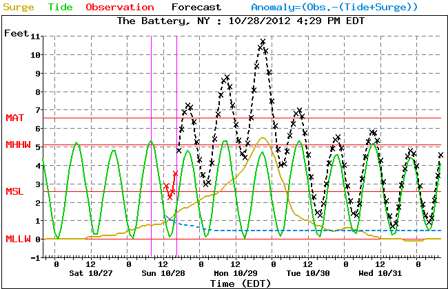 Forecasted Water Rise at New York City (almost 11ft). Record is 10.5ft: