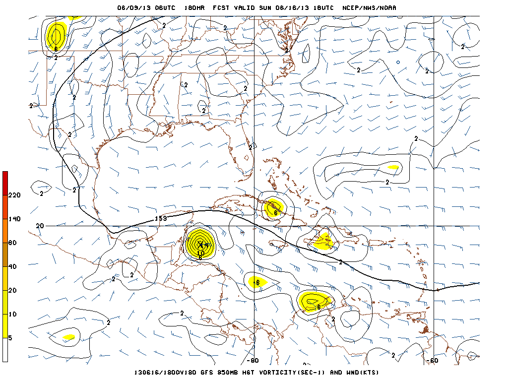 We are beginning to see some hints in the longer range reliable Global and Ensemble guidance suggesting the monsoonal trough will begin to lift N from the Western Caribbean during the later half of the medium range (6-7 days). As the monsoonal trough lift N and W some vorticity or cyclonic spin at the surface is noted to develop and head generally WNW into the Western Gulf beyond the June 17th to 19th timeframe. While this is rather far out in model world, the longer range guidance did do rather well in suggesting Andrea would develop beyond the 192 hour timeframe so it may be worth watching over the next week or so.