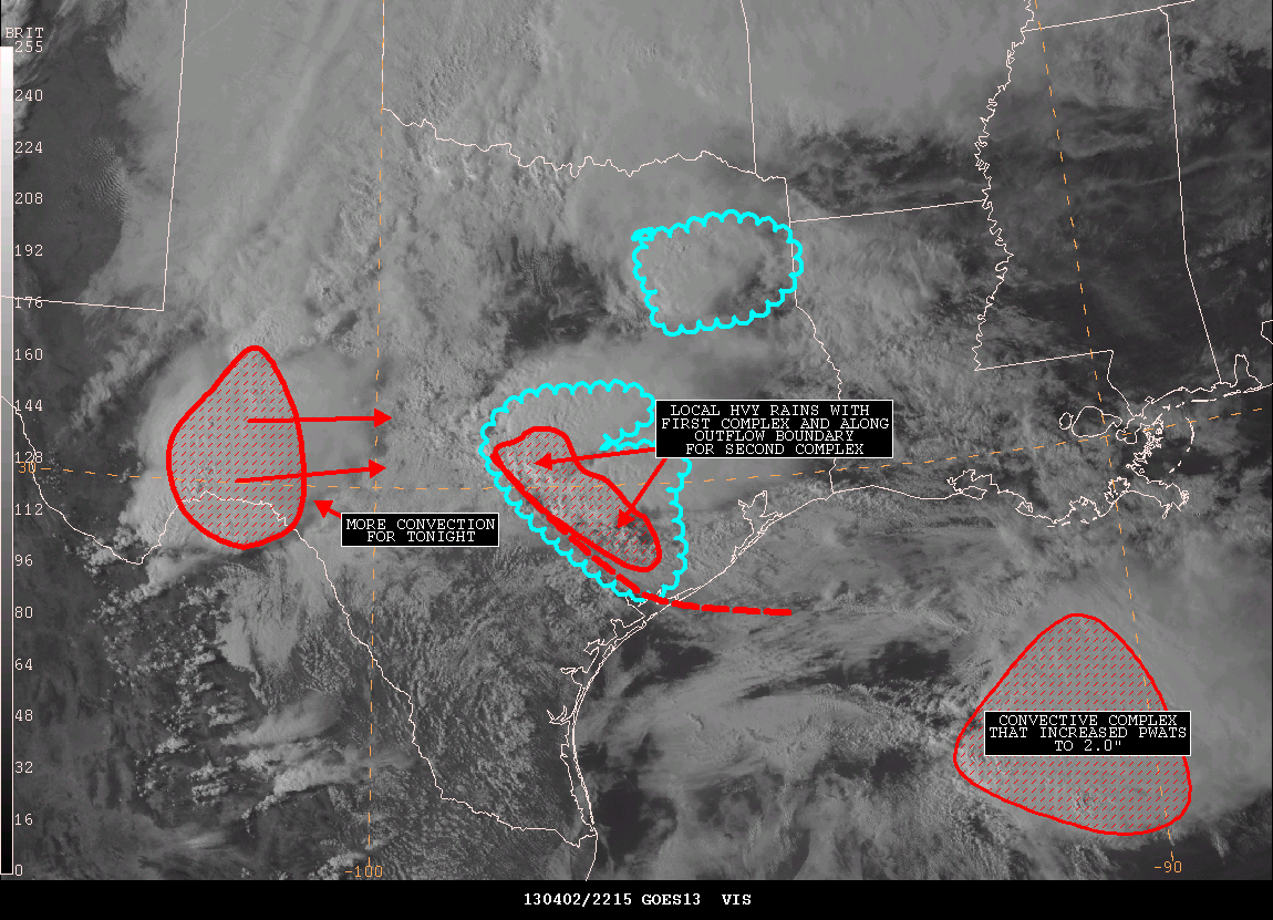 "Boundary" Seems to be set up just SW of College Station and south of Austin. This should be the focal point for stronger storms especially later when the piece of energy from the west arrives.