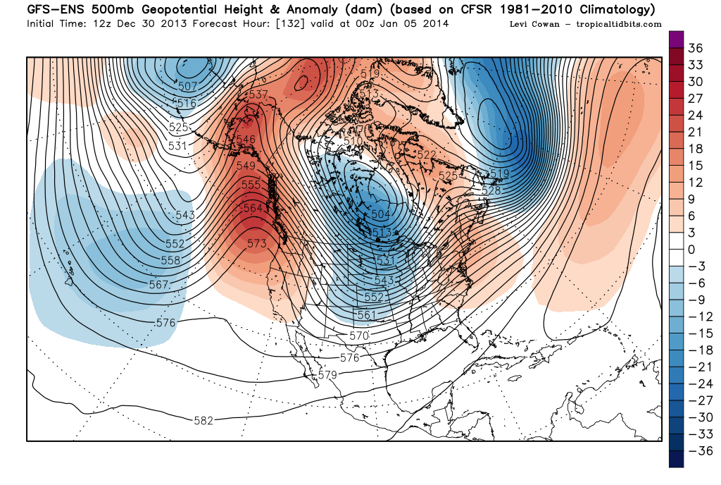The 12Z GEFS ensemble mean certainly paint a pattern that is more than capable of delivering Arctic air well S into the Inter Mountain West and Plains. This is hour 132, so we are not talking about something that is way out in the future in computer model land.