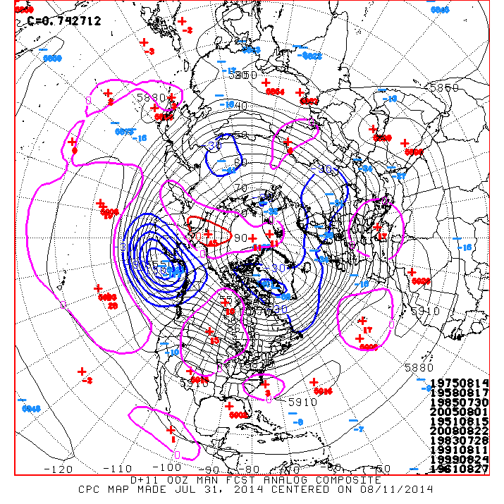 Looking ahead toward the middle of August, there is growing consensus via the medium/long range guidance that yet another unseasonably strong shot of cooler air pushes S from Canada as a deep trough digs south, east of the Rockies and settles along the Gulf Coast. Tropical activity in the Western Pacific as well as the anomalous warm pool of water across the North Pacific continues to suggest that a general pattern of a West Coast Ridge with little in the way of relief in there long term drought, the monsoonal pattern continuing across the Eastern Half of Arizona into New Mexico, which has seen much above normal rainfall from the position of the monsoon (remember I commented a couple of months ago I thought the monsoon would be centered more over New Mexico than Arizona) with continued storms firing and riding above the Ridge into Colorado and eventually into the Plains. I still do not see temperatures approaching that 100F mark across the Coastal Plains of the NW and Central Gulf Coast at this time.