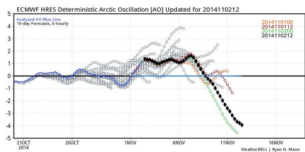 A quick look at the longer range 12Z 11/02/2014 European computer guidance because I know there is a lot of 'chatter' concerning the potential cold and stormy pattern across the various website and social media. The Global models are slowly coming together suggesting a developing pattern conducive for bringing a lot of the cold and snowy Canadian air well south into the Central and Eastern United States. As always, I'll offer a word of caution as we know all too well that computer guidance beyond 5 days is going to change...and sometimes daily. That said and as mentioned earlier today, the teleconnection indices are increasing lending to a bit of confidence that the models are 'sniffing' out a significant pattern change. Add to the mix Super Typhoon Nuri that should pass E of Japan as it transitions to a powerful extra tropical storm in or near the Bering Sea in about a week, the interest increases and raises an eyebrow regarding the potential sensible weather we could see across our Region near the mid November timeframe.