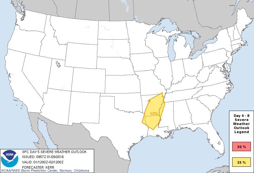 Beautiful mostly sunny and warm weather to end the last weekend of Jan 2016 across SE TX. Lots of sun and highs in the low to mid 70s through the weekend. The big weather story early next week with be a significant severe weather event across the Deep South. W TN, N MS, and N AL are in a 30% risk area for next Tuesday.